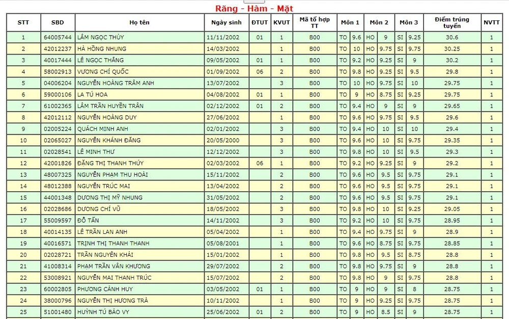 Ở ngành Răng hàm mặt, có 16 thí sinh đạt từ 29 điểm trở lên. Trong đó có ba em đạt từ 30 điểm xét tuyển, cao nhất là thí sinh Lâm Ngọc Thùy với điểm trúng tuyển là 30,6.