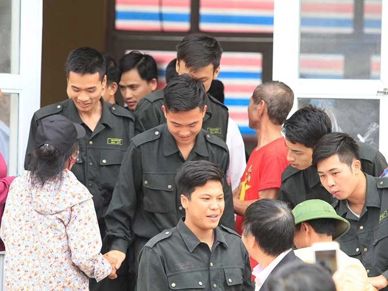 19 cán bộ, chiến sĩ chào bà con Đồng Tâm ra về sau một tuần bị giữ tại Nhà văn hóa thôn Hoành. Ảnh: TP