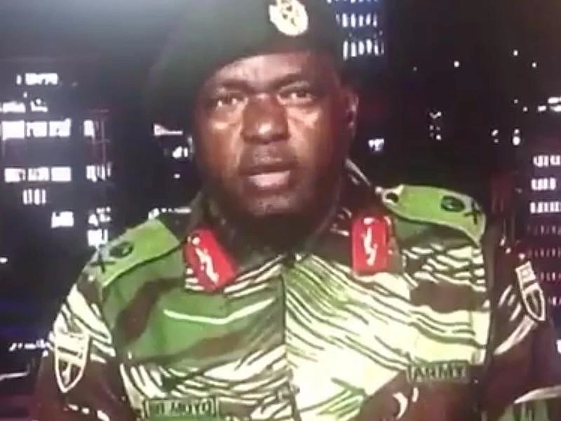 Thiếu tướng Sibusiso Moyo phát biểu về cuộc binh biến ở Harare sau khi quân đội Zimbabwe giành quyền kiểm soát đài truyền hình quốc gia ZBC sáng 15-11. Ảnh: ZBC
