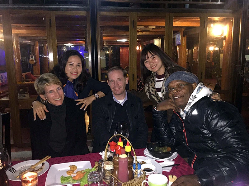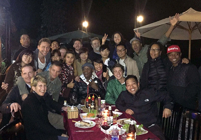 Đoàn làm phim chụp ảnh trong bữa tiệc. Ảnh: CTV