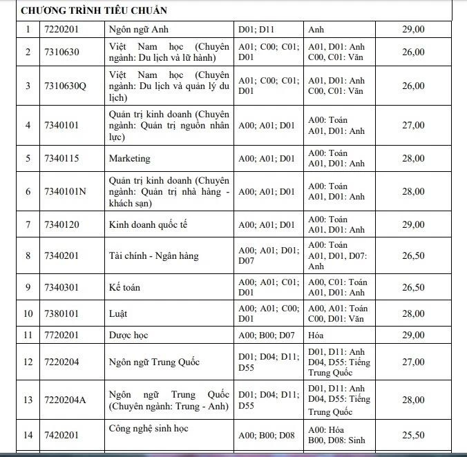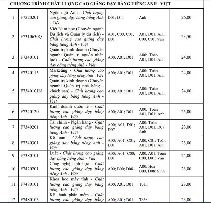 Còn ở chương trình chất lượng cao giảng dạy bằng tiếng Anh, mức điểm sàn từ 22,5 đến 24. Các ngành có điểm cao nhất là Ngôn ngữ Anh, Marketing và Quản trị Kinh doanh (chuyên ngành Quản trị Nhà hàng - Khách sạn).