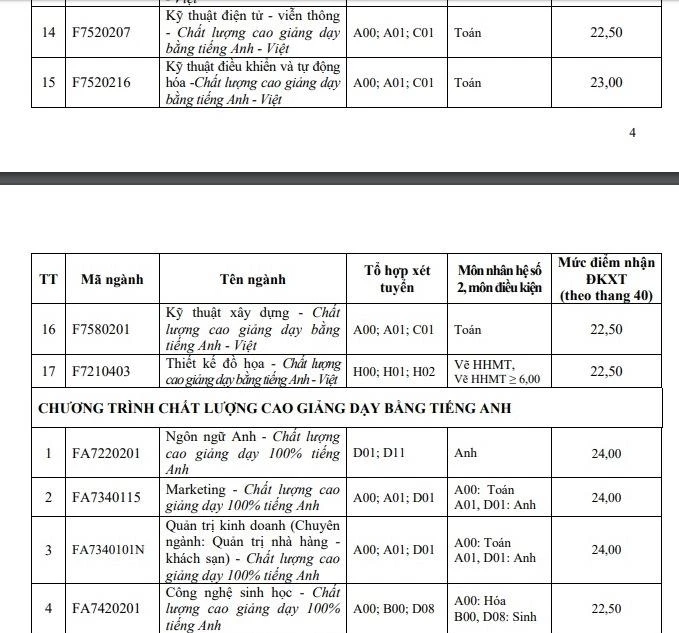 Ở chương trình chất lượng cao giảng dạy bằng tiếng Anh - Việt, điểm sàn dao động là từ 22,5 đến 26. Trong đó, Ngôn ngữ Anh là ngành có điểm sàn cao nhất: 26.