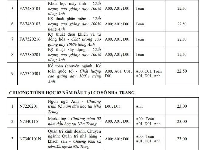 Ở chương trình học hai năm đầu tại cơ sở Nha Trang, điểm sàn từ 22,5 đến 23. Trong đó, bốn ngành có điểm cao nhất là Ngôn ngữ Anh, Marketing, Quản trị Kinh doanh (chuyên ngành Quản trị Nhà hàng - Khách sạn) và Luật.