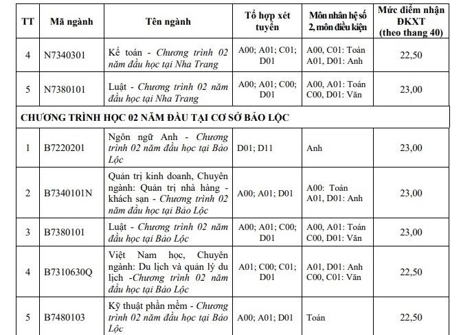 Đối với chương trình học hai năm đầu tại cơ sở Bảo Lộc, mức điểm sàn cao nhất là 23, bao gồm các ngành Ngôn ngữ Anh, Quản trị Kinh doanh (chuyên ngành Quản trị Nhà hàng - Khách sạn) và Luật.