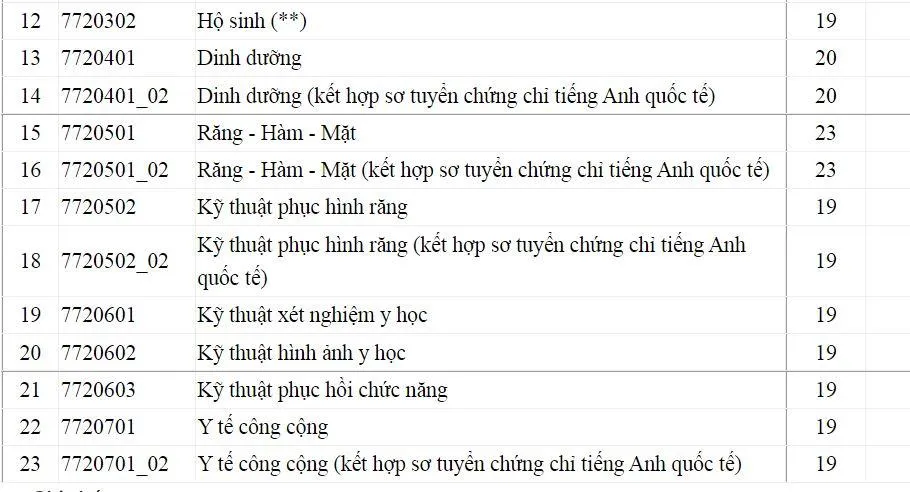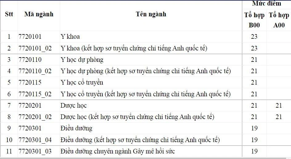 Theo đó, nhóm ngành có điểm sàn cao nhất là Y khoa và Răng hàm mặt với 23 điểm, các ngành còn lại từ 19 đến 21 điểm. Cụ thể như sau: