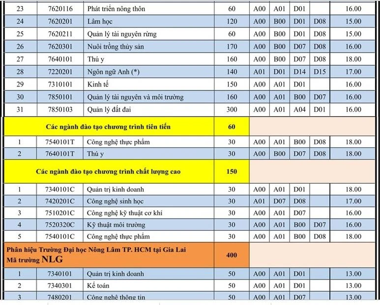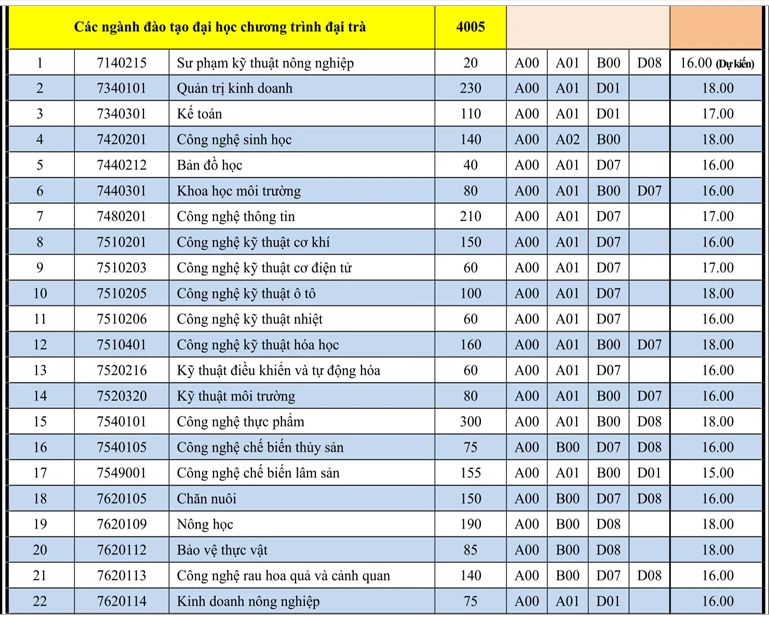 Theo đó, mức điểm sàn cao nhất của trường là thuộc các ngành như Thú y, quản trị kinh doanh, công nghệ sinh học, nông học, Công nghệ kỹ thuật hóa học, Bảo vệ thực vật, Công nghệ thực phẩm.
