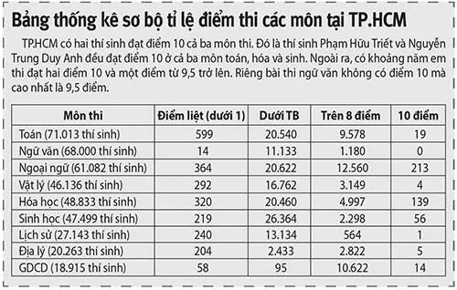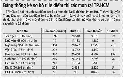 Thống kê tại TP.HCM cho thấy có 453 điểm 10 ở các môn thi. Ngoại trừ môn văn, các môn còn lại đều có điểm 10. Trong đó môn toán có 19 điểm 10, môn sử 1, GDCD 15, địa lý 5, vật lý 4, sinh học 56. Hai môn có điểm 10 cao ngất đó là hóa học (139) và ngoại ngữ (214).