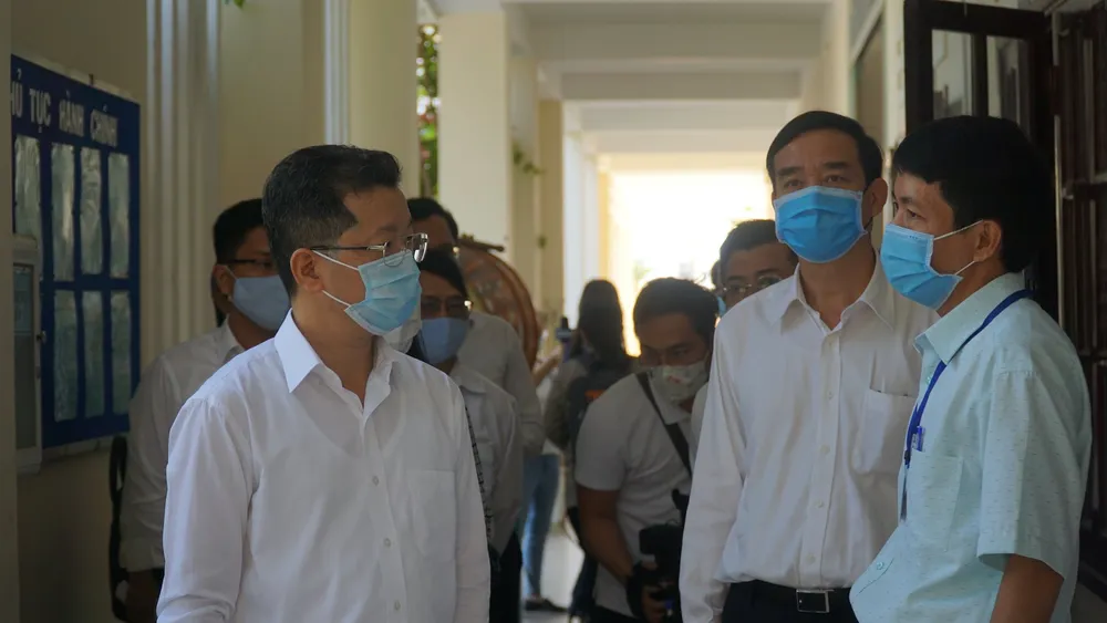Sáng 1-9, ông Nguyễn Văn Quảng (Phó Bí thư thường trực Thành ủy Đà Nẵng) và ông Lê Trung Chinh (Phó Chủ tịch UBND TP) đã đi kiểm tra công tác phòng, chống dịch tại điểm thi trường THPT Võ Chí Công (phường Hòa Quý, quận Ngũ Hành Sơn).