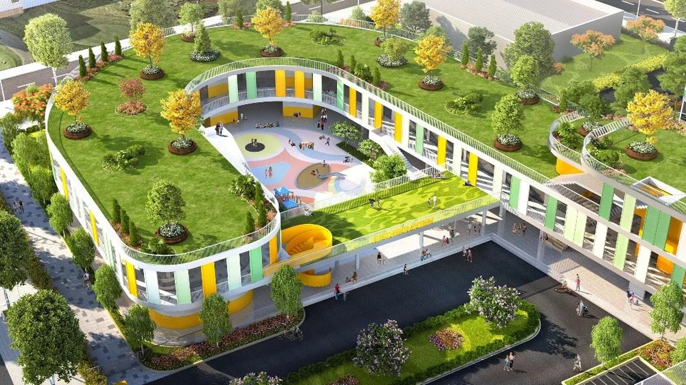 Mặt khác, yếu tố xanh trong không gian còn được thể hiện ở thiết kế độc đáo mang phong cách quốc tế của hệ thống trường liên cấp từ mầm non - tiểu học - THCS.