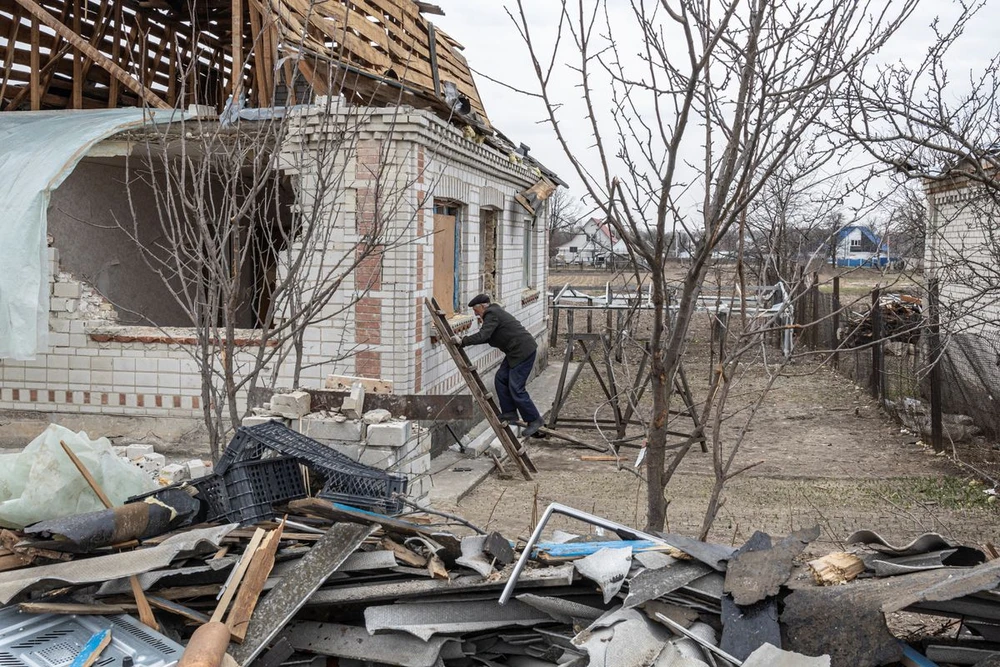 Một người đàn ông trèo lên chiếc thang bên ngoài ngôi nhà của ông bị các cuộc không kích của Nga phá hủy vào ngày 26-3 ở TP Lviv, Ukraine. Ảnh: REUTERS