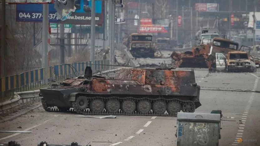 Xác xe bọc thép của Nga và các phương tiện quân sự khác được nhìn thấy ở tiền tuyến gần Kiev, Ukraine, vào ngày 29-3. Ảnh: REUTERS