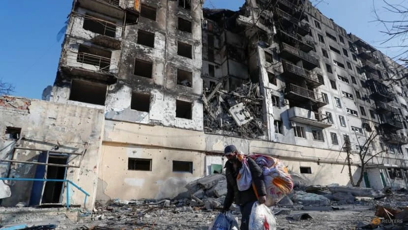Người dân Ukraine mang đồ di tản khỏi tòa nhà bị các cuộc không kích của Nga phá hủy ở TP Mariupol, vào ngày 28-3. Ảnh: REUTERS