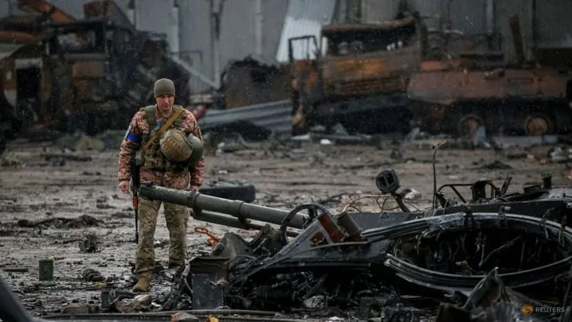 Binh sĩ Ukraine kiểm tra đống đổ nát tại sân bay Antonov sau cuộc không kích của Nga vào ngày 3-4. Ảnh: REUTERS