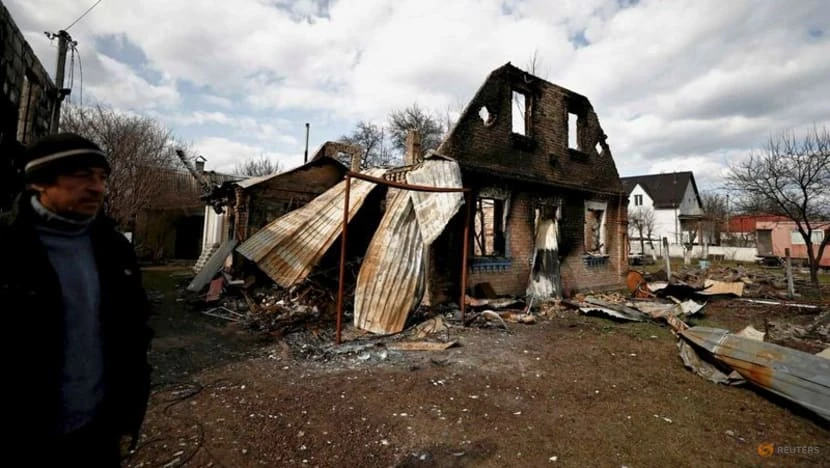 Một ngôi nhà bị phá hủy sau trận pháo kích của Nga ở Bucha vào ngày 4-4. Ảnh: REUTERS
