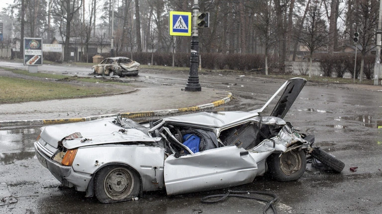 Một chiếc ô tô bị phá hủy sau trận pháo kích của Nga ở Bucha. Ảnh: RT