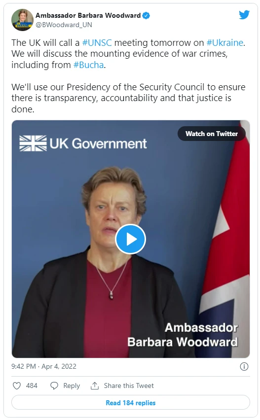 . Ukrinform dẫn thông tin từ Đại sứ Anh tại Liên Hợp Quốc (LHQ) Barbara Woodward cho biết London sẽ triệu tập cuộc họp khẩn tại Hội đồng Bảo an LHQ vào ngày 5-4 để thảo luận về các vụ sát hại dân thường do quân đội Nga thực hiện ở Bucha.