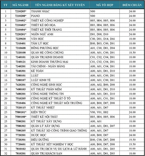 Trường cũng lưu ý, thí sinh đăng ký xét tuyển học bạ THPT đợt 1 vào 7 ngành năng khiếu (Kiến trúc, Thiết kế công nghiệp, Thiết kế thời trang, Thiết kế đồ họa, Thiết kế nội thất, Piano, Thanh nhạc) mà chưa có điểm thi năng khiếu hoặc chưa nộp phiếu điểm thi năng khiếu, trường vẫn tiếp tục giữ hồ sơ xét tuyển trong đợt 1, chờ bổ sung để hoàn thành xét tuyển.