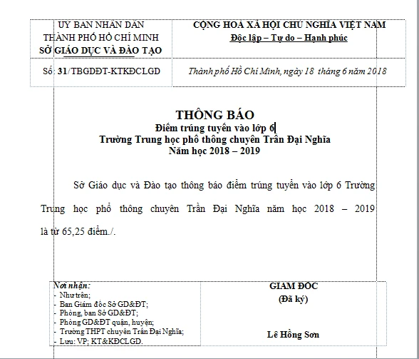 Trước đó, chiều 17-6, Sở GD&ĐT đã công bố điểm thi vào lớp 6 Trường chuyên Trần Đại Nghĩa năm học 2018-2019.