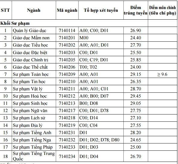 Theo đó, ngành có điểm chuẩn cao nhất là sư phạm hóa với 29,45 điểm. Riêng ngành sư phạm toán, dù điểm chuẩn ở mức 29,15 nhưng thí sinh trúng tuyển còn phải đáp ứng thêm tiêu chí phụ về điểm môn chính trên 9,6.