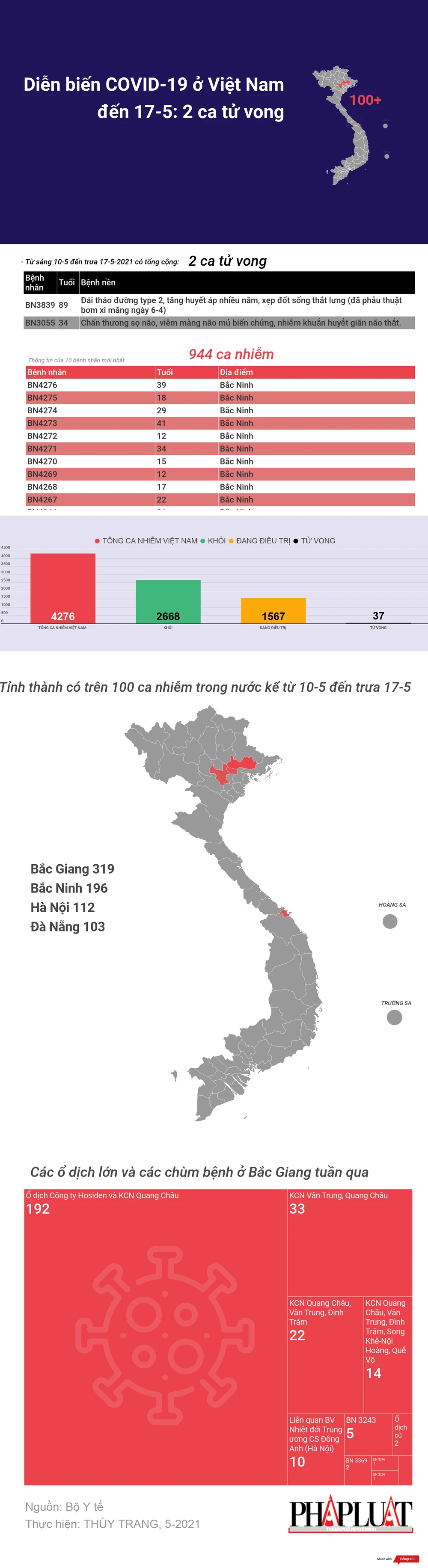 (PLO)- Dưới đây là sơ đồ cập nhật diễn biến dịch COVID-19 ở Việt Nam tuần qua. Đáng chú ý có 2 ca tử vong kèm bệnh lý nền và các chùm bệnh, ổ dịch lớn tại Bắc Giang từ sáng ngày 10 đến trưa 17-5.