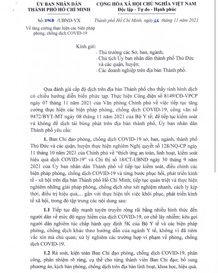 Chiều 11-11, ông Lê Hòa Bình, Phó Chủ tịch UBND TP.HCM đã ký văn bản số 3768 gửi thủ trưởng các sở ngành, chủ tịch UBND các quận huyện và TP Thủ Đức và các doanh nghiệp trên địa bàn về tăng cường các biện pháp phòng chống dịch COVID-19.