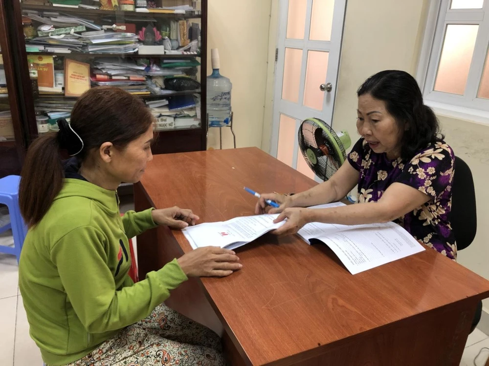 Bà Thơm đang trình bày sự việc với luật sư Trần Thị Ngọc Nữ - Chi hội trưởng Chi hội Luật sư Hội Bảo vệ quyền trẻ em TP.HCM. Ảnh: SL