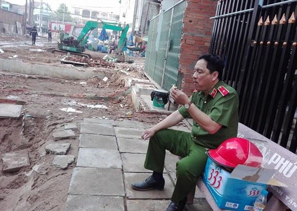 Thiếu tướng Đỗ Minh Dũng, phó cục trưởng Cục Cảnh sát PCCC (Bộ công an) ăn vội bánh mì lót dạ sau một đêm trực chiến