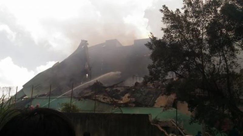 Ngọn lửa đã tạm thời bị khống chế, khói đen vẫn còn bốc ngi ngút từ khu vực cháy.