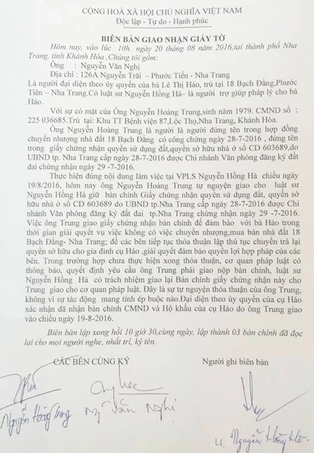 Theo biên bản giao nhận giấy tờ do hai bên đồng ký tên, ông Nguyễn Hoàng Trung tự nguyện giao cho luật sư Nguyễn Hồng Hà giữ bản chính GCN do UBND TP Nha Trang cấp ngày 28-7 đứng tên cụ Lê Thị Háo. GCN này do Chi nhánh Văn phòng Đăng ký đất đai TP Nha Trang chứng nhận chuyển nhượng sang ông Trung ngày 29-7.