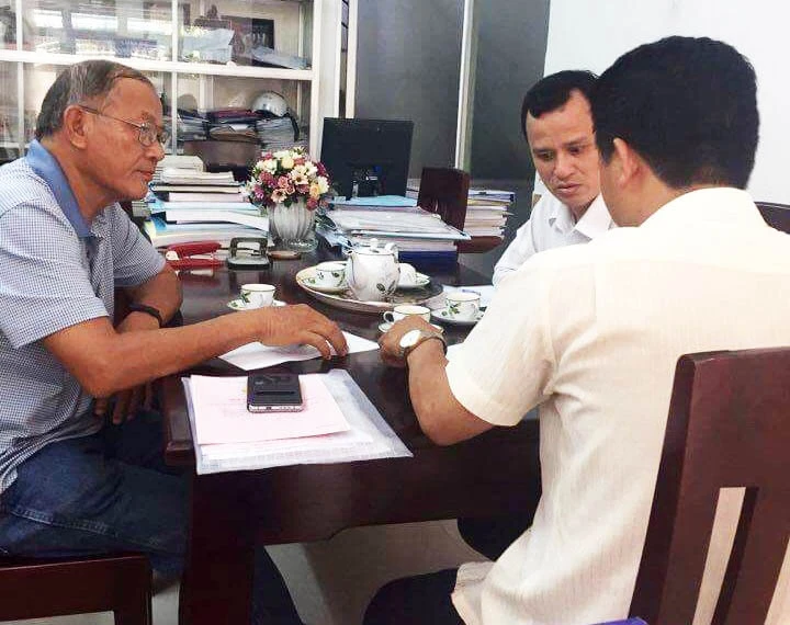 Đạ diện gia đình cụ Háo (bìa trái) và luật sư (giữa) làm thủ tục nhận lại giấy chứng nhận của ngôi nhà.