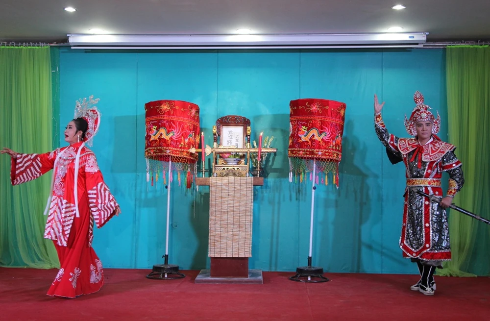 Chặp cải lương Khóc Võ Tánh do Tú Quyên và Lý Trung Tín trình diễn.