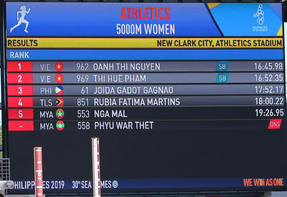 Ngày thi đấu hôm nay (10-12) tại SEA Games 30, đoàn thể thao Việt Nam tiếp tục “gom” thêm 2 HCV tại hai bộ môn điền kinh và bơi lội. Tại môn điền kinh nội dung chạy 5.000 m nữ, VĐV Nguyễn Thị Oanh đã xuất sắc về nhất với thời gian 16 phút 45 giây 98.