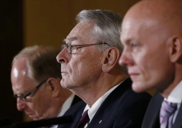 Chủ tịch WADA Richard Pound (giữa), cựu Phó Chủ tịch Ủy ban Olympic Quốc tế (phải) và ông Rachard McLaren (bìa trái), Phụ trách pháp lý của Tòa án Thể thao quốc tế trong cuộc họp báo.