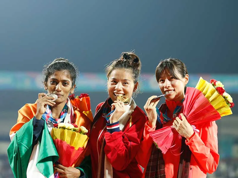 VĐV Nguyễn Thị Huyền (giữa)vô địch 400 m vượt rào nữ châu Á nhưng không có suất tham dự giải vô địch thế giới. Ảnh: ODISHA