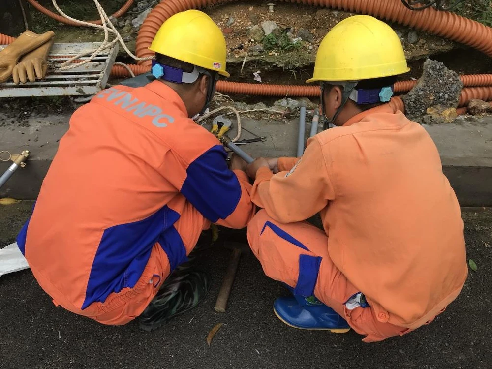 Công nhân Công ty Điện lực Quảng Ninh đang kiểm tra và khắc phục sự cố do mưa bão.