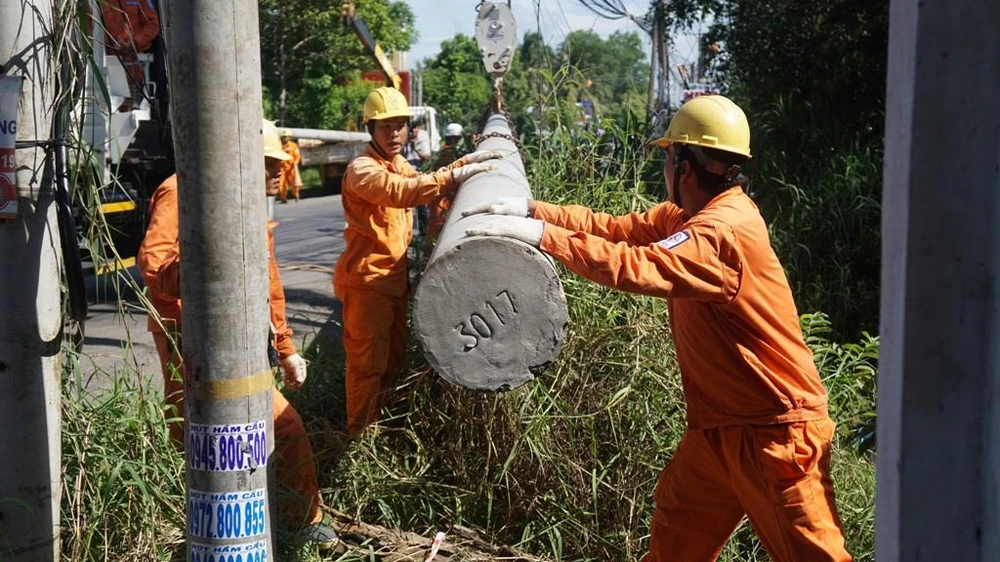 Lực lượng công nhân điện của các đơn vị phối hợp khắc phục sự cố lưới điện do bão nhằm tái lập điện an toàn cho khu vực. Ảnh: H. Kim