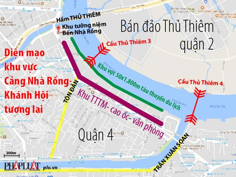 | Trở thành đất vàng Theo Sở GTVT TP, cầu Thủ Thiêm 4 nối từ khu đô thị mới Thủ Thiêm, quận 2 qua đường Nguyễn Văn Linh, quận 7 sẽ được đầu tư theo hình thức BT (xây dựng - chuyển giao). Theo thiết kế, cầu Thủ Thiêm 4 sẽ là cầu dây văng với chiều dài 2,1 km. Cầu bắt đầu từ đường Nguyễn Văn Linh với các nút giao Nguyễn Văn Linh - cầu Tân Thuận 2 và hai nhánh cầu dẫn N1, N2 từ cầu chính phía quận 7 xuống đường Huỳnh Tấn Phát (gần cổng Khu chế xuất Tân Thuận). Tổng kinh phí xây dựng cầu hơn 5.300 tỉ đồng. Đến nay, có nhiều nhóm liên danh nhà xây dựng cầu đường và đầu tư bất động sản đề xuất xây cầu Thủ Thiêm 3 và nâng cấp đường Tôn Đản theo hình thức đối tác công tư. Theo đó, điểm đầu của cầu Thủ Thiêm 3 sẽ từ đường Tôn Đản, quận 4, băng qua đường Nguyễn Tất Thành đi vào cổng chính của cảng Khánh Hội hiện hữu rồi vượt sông Sài Gòn để nối với khu đô thị mới Thủ Thiêm ở quận 2. Với việc làm hai cầu trên sẽ tạo ra vị trí địa lý đất vàng cho khu cảng Nhà Rồng - Khánh Hội hiện hữu. Cụ thể, với phía Nam-Đông Nam tiếp giáp kênh Tẻ, cầu Tân Thuận và cầu Thủ Thiêm 4; phía Đông-Đông Bắc tiếp giáp sông Sài Gòn; phía Tây-Tây Nam là đại lộ Nguyễn Tất Thành mở rộng; phía Bắc là kênh Bến Nghé và hầm Thủ Thiêm; ở chính giữa là cầu Thủ Thiêm 3. |
