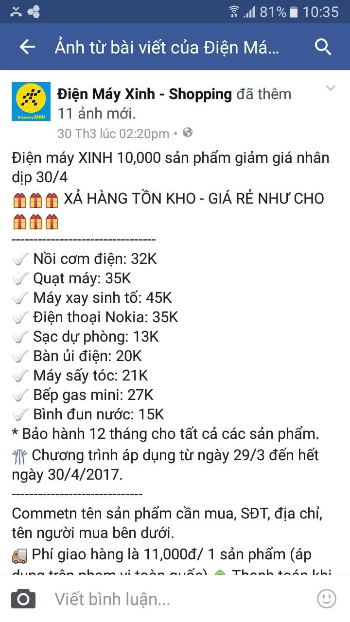 Vài ngày gần đây, mạng xã hội facebook xuất hiện trang fanpage Điện máy Xinh tung ra chương trình xả hàng tồn kho-giá rẻ như cho nhân dịp 30-4. Với 10.000 sản phẩm giảm giá, gồm các mặt hàng gia dụng, điện thoại giá chỉ từ 15.000 ngàn đồng đến 35.000 đồng.