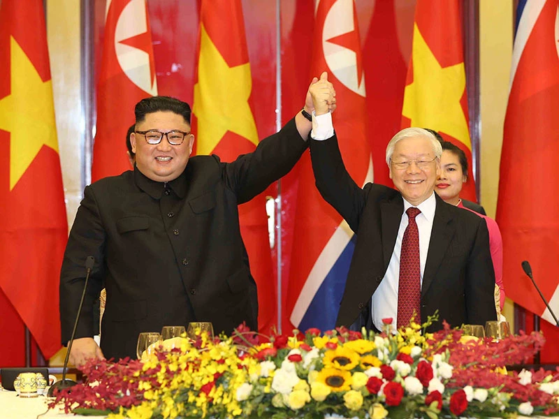 Tổng bí thư, Chủ tịch nước Nguyễn Phú Trọng chào mừng Chủ tịch Triều Tiên Kim Jong-un tại buổi tiệc chiêu đãi tối 1-3-2019. Ảnh: TTXVN
