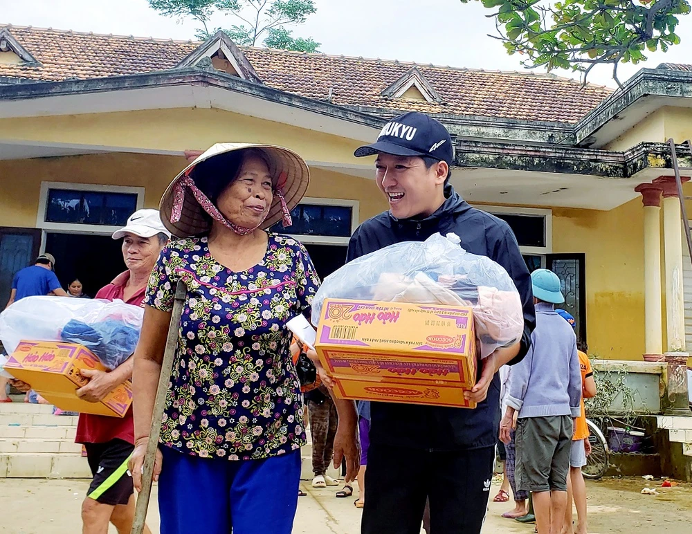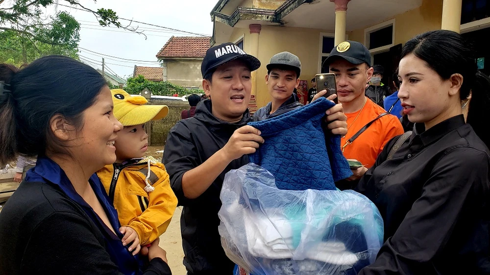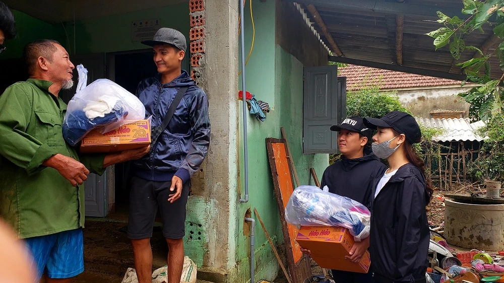 Trong đó, nghệ sĩ Trường Giang và diễn viên Lê Dương Bảo Lâm đã trao tặng cho gia đình ông Phạm Ngọc Dũng ba con bò sau khi cả ba con bò của ông bị nước lũ cuốn trôi.