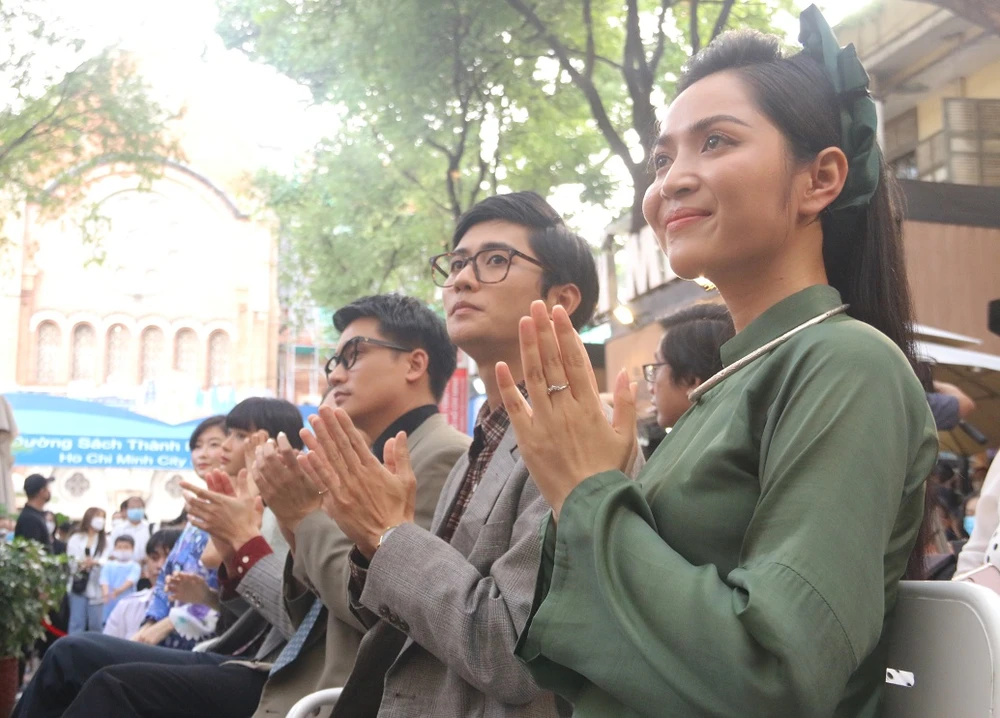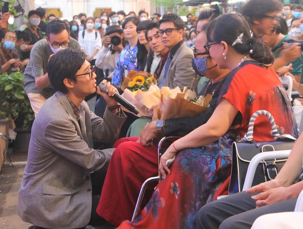 Nam chính phim “Em và Trịnh” thể hiện niềm kính trọng với nghệ sĩ Trần Mạnh Tuấn. Ảnh: THẢO PHƯƠNG