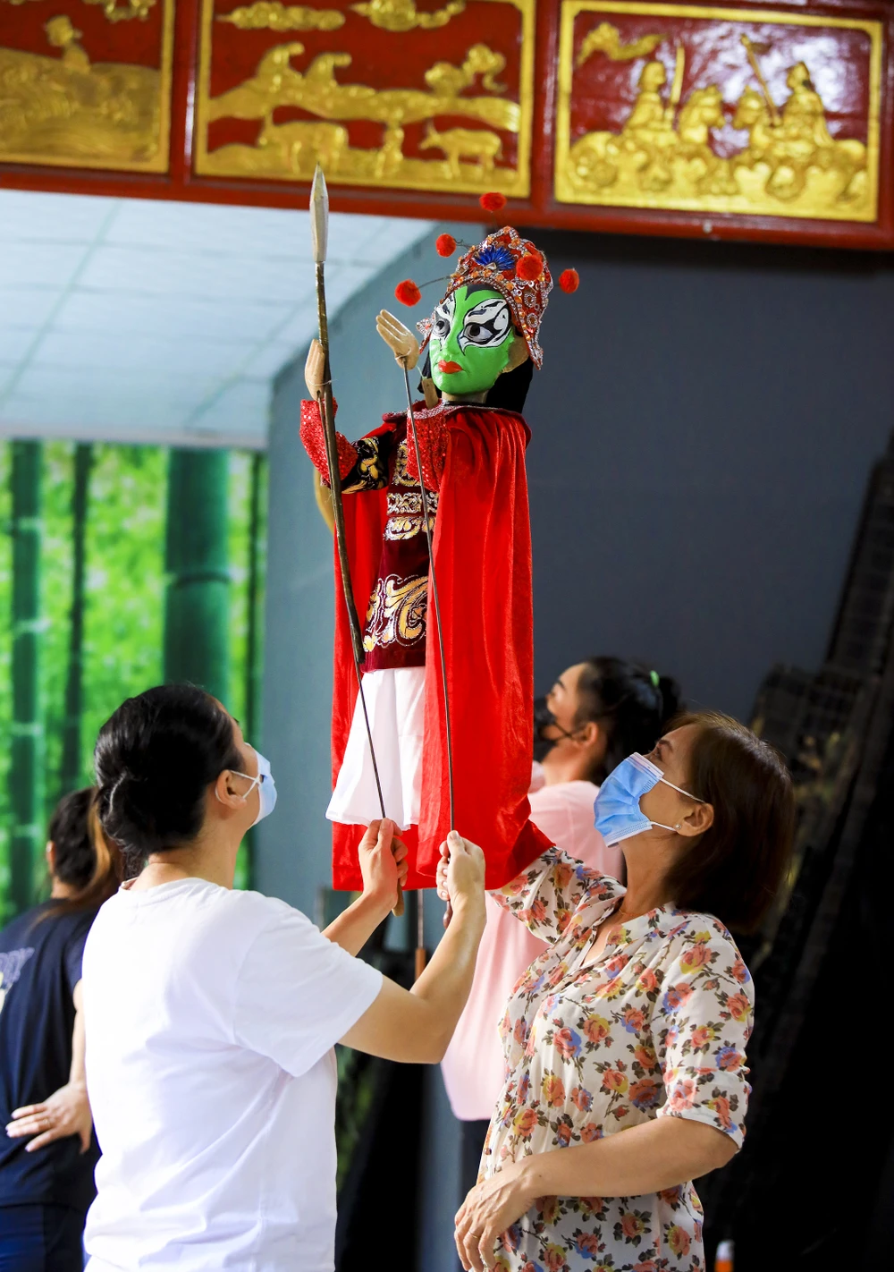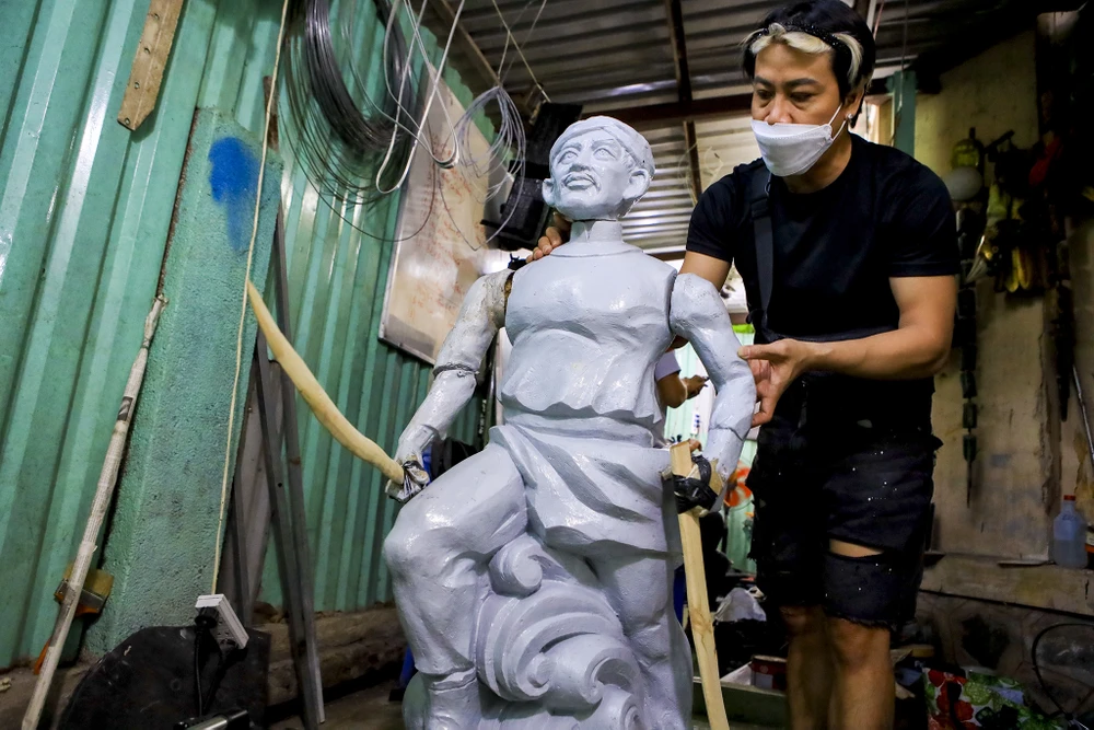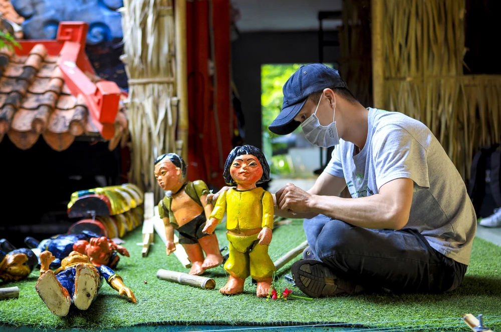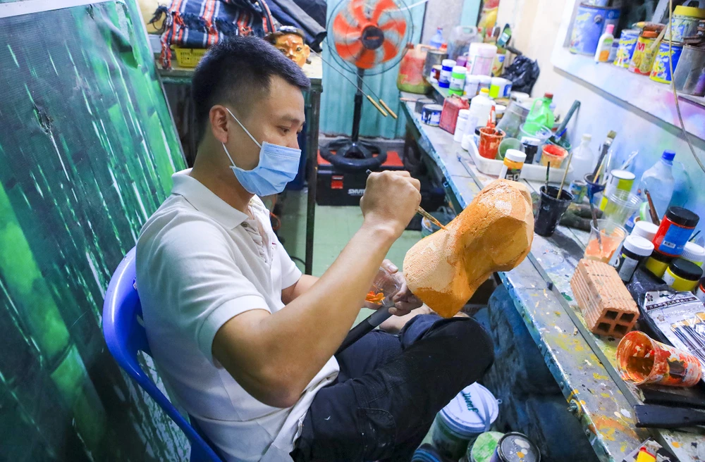 "Mỗi ngày chúng tôi có mặt từ 8h đến 20h để làm việc. Sau nhiều tháng tạm nghỉ vì dịch bệnh, tất cả mọi người rất vui và phấn khởi khi trở lại nhịp sống bình thường. Thời gian này, mỗi người chúng tôi một nhiệm vụ, tập trung toàn lực để xây dựng vở diễn mới." - Anh Chu Mạnh Cương (họa sĩ tạo hình cho những nhân vật rối nước) chia sẻ.