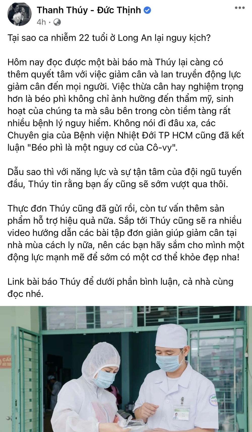 Ngày 4-6, trên trang fanpage của vợ chồng diễn viên Thanh Thúy và đạo diễn Đức Thịnh có đăng tải nội dung: “Tại sao ca nhiễm 22 tuổi ở Long An lại nguy kịch?”.