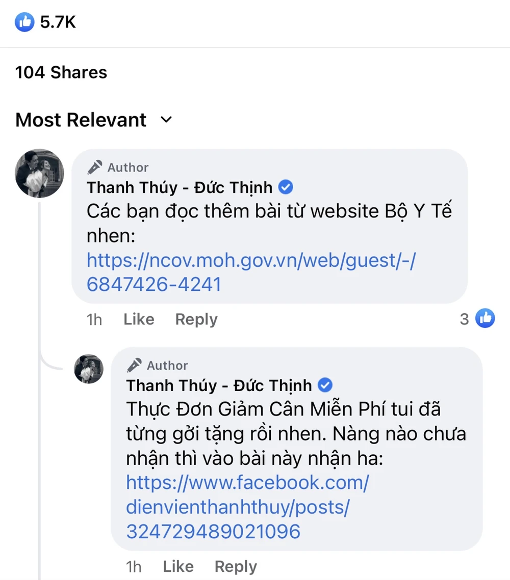 Cùng đó, dưới phần bình luận cũng đã đường dẫn đến một nội dung khác trên trang fanpage của Thanh Thúy – Đức Thịnh với nội dung Thực đơn giảm cân miễn phí. Vào đường dẫn ngày nếu tương tác, người dùng sẽ tiếp tục được nhận thực đơn giảm cân tại nhà cùng sản phẩm hỗ trợ giảm cân an toàn.