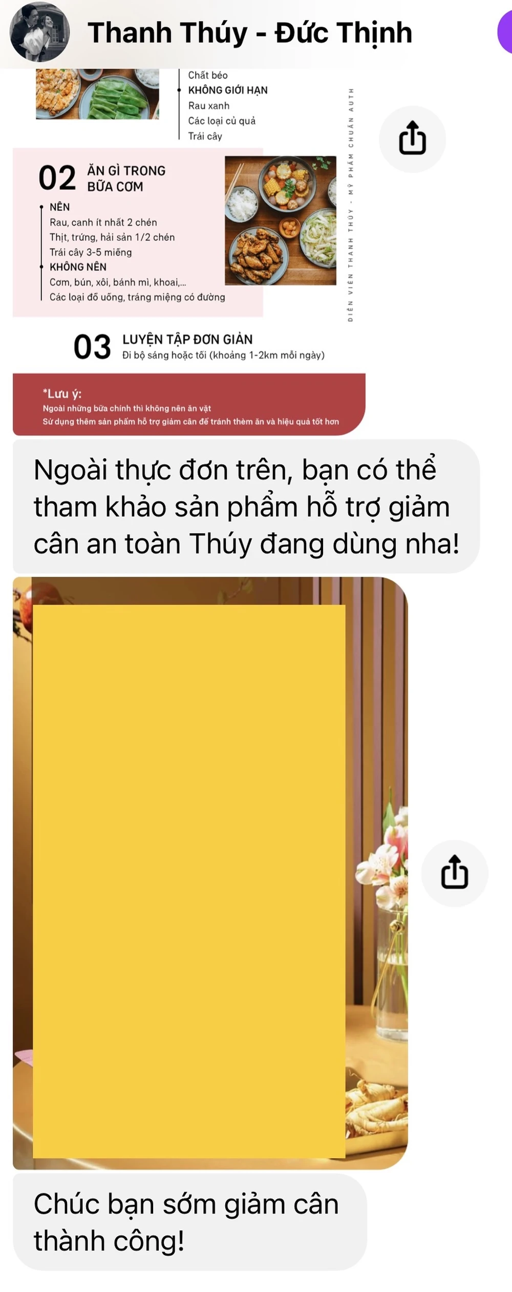 Thực đơn Thúy cũng đã gửi rồi, còn tư vấn thêm sản phẩm hỗ trợ hiệu quả nữa. Sắp tới Thúy cũng sẽ ra nhiều video hướng dẫn các bài tập đơn giản giáp giảm cân tại nhà mùa cách ly nữa, nên các bạn hãy sắm cho mình một động lực mạnh mẽ để sớm có một cơ thể khoẻ đẹp nha!”.