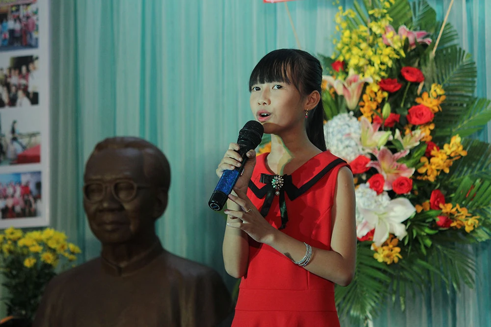 Bé Thùy Duyên (12 tuổi) góp vào chương trình tiết mục Vọng Kim Lan.