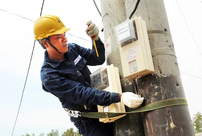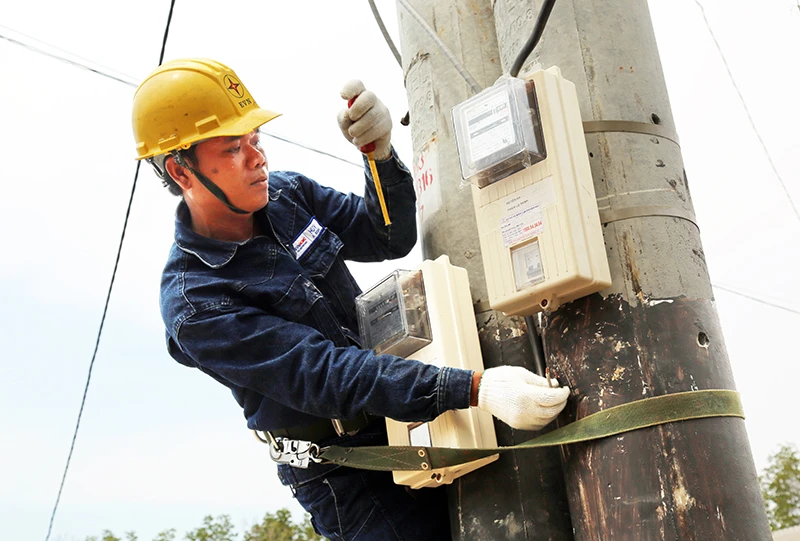 Công nhân Tổng Công ty Điện lực TP.HCM đang lắp điện kế cho bà con ấp Thiềng Liềng