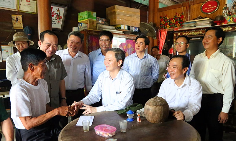 Phó Chủ tịch UBND TP Lê Văn Khoa (giữa) và ông Lê Văn Phước - Chủ tịch, Tổng Giám đốc Tổng Công ty Điện lực TP.HCM thăm hỏi hộ dân trên ấp Thiềng Liềng, xã Thạnh An, huyện Cần Giờ, TP.HCM