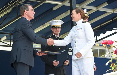 Bộ trưởng Quốc phòng Mỹ Ashton Carter chúc mừng các học viên tốt nghiệp Học viện Hải quân ngày 27-5. Ảnh: BỘ QUỐC PHÒNG MỸ