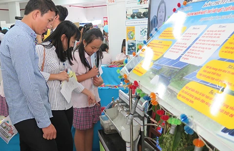 Các học sinh đang thuyết trình dự án của mình tại triển lãm . Ảnh: P. ANH